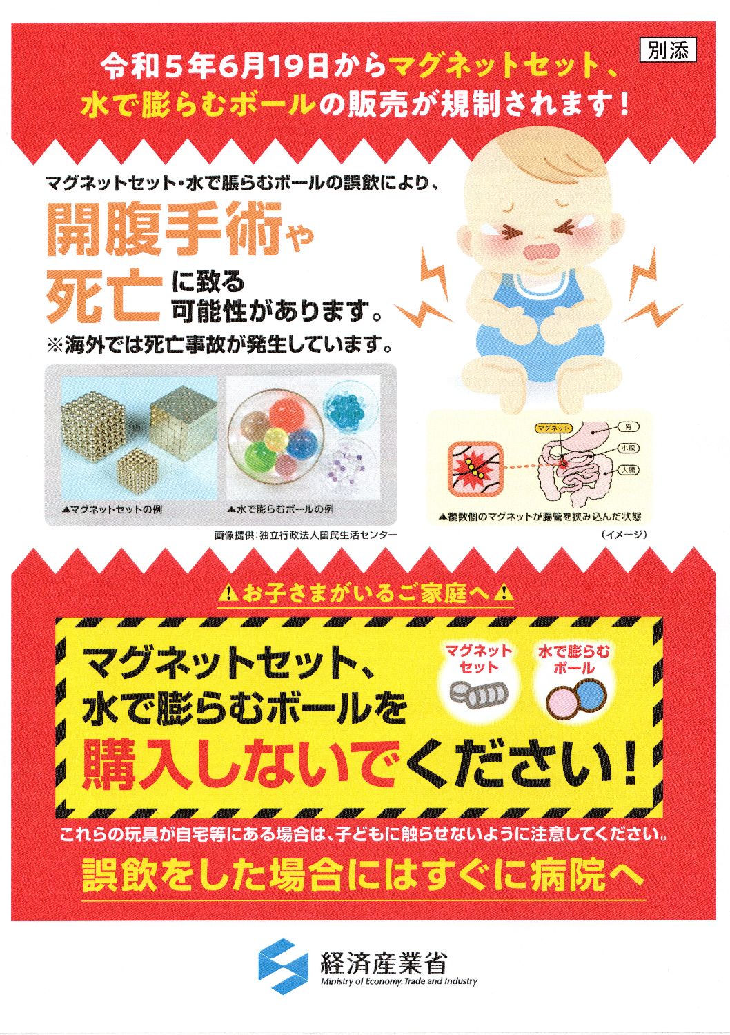 子ども(特に乳幼児)の安全の観点から、今年6 月19 日より販売が規制された2 つの玩具について、その利用・購入を避けるよう、文部科学省より注意喚起がありましたのでお知らせいたします。