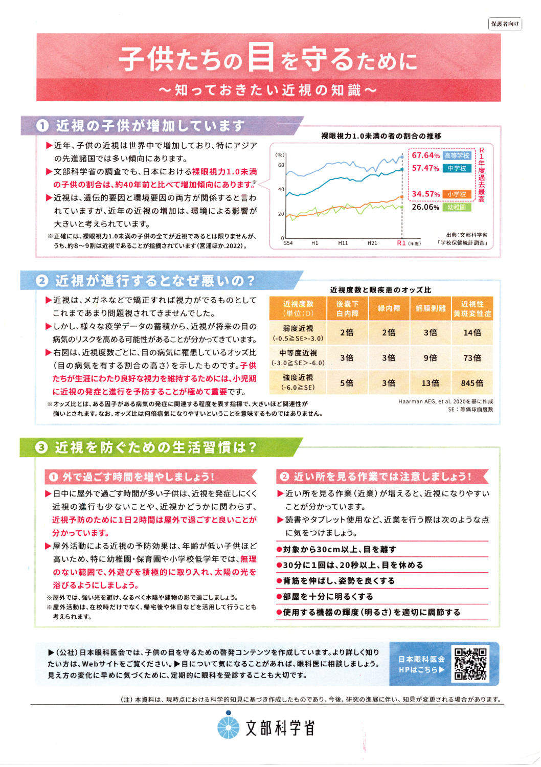 近年、子ども達の視力は世界的に低下傾向にあるそうです。要因としてテレビやスマホの普及やゲームの影響が大きいと考えられておりますが、最近の研究で視力低下が将来の眼病発症リスクを高めている事が分かってきました。文部科学省から『目の健康を維持する為の啓発資料』が届きましたのでお知らせいたします。各ご家庭で参考にしてください。