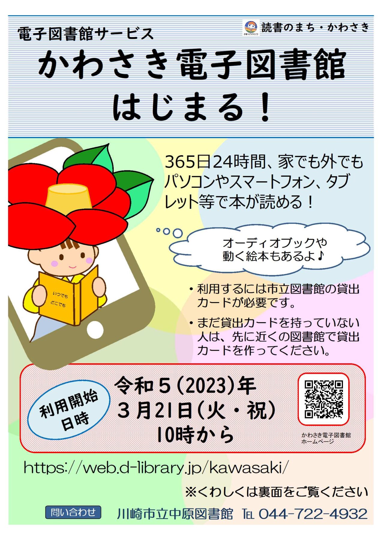 令和5年3月21日より「かわさき電子図書館」が始まりました。365日24時間、家でも外でも、パソコン、スマートフォンやタブレットで本が読めます。