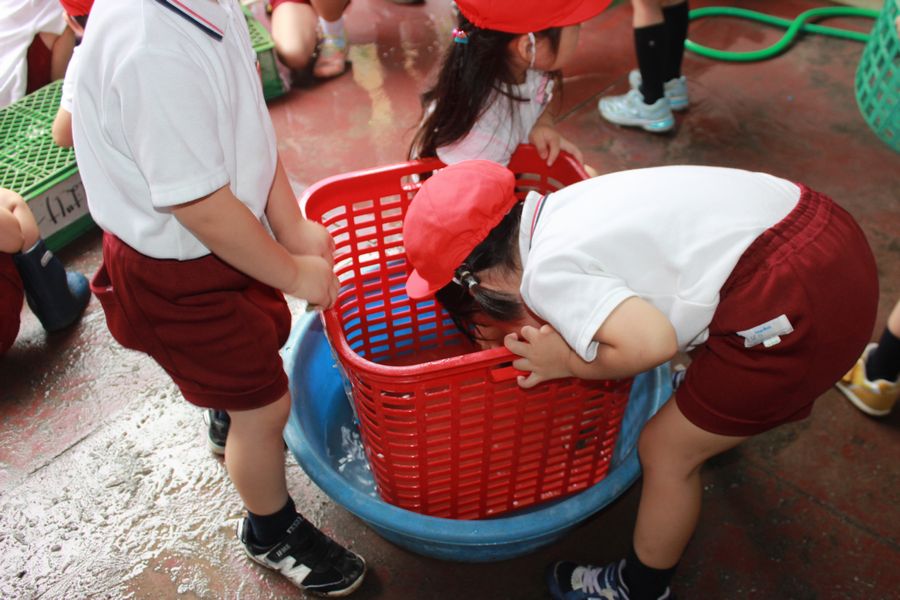 自由遊びの時間に、クラス毎ピロティに召集して一人一つずつ玩具を選び洗ってもらいました。スポンジを使って丁寧に泥を落としました。
