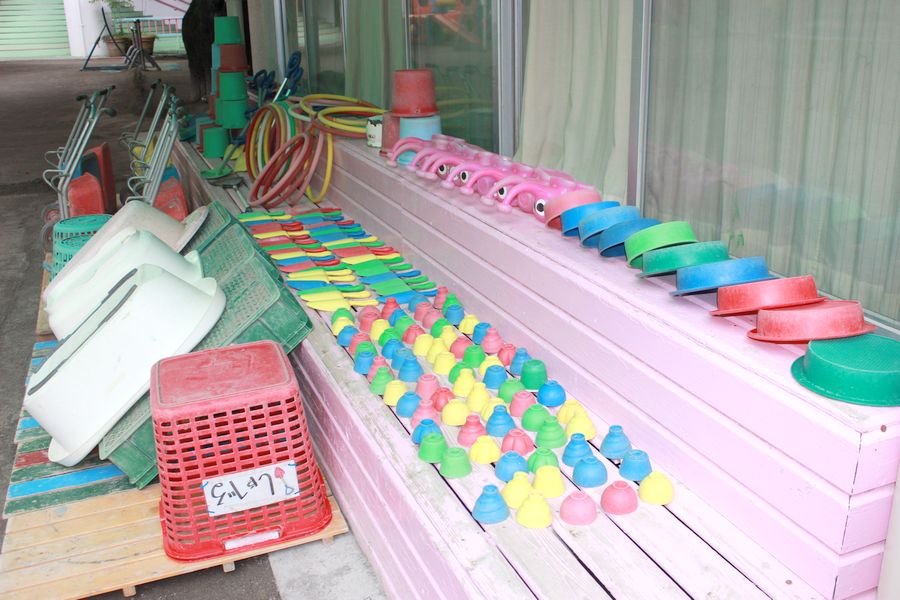 洗い終わった玩具は良く日の当たるもも組前の木の椅子のところに並べて天日干しをします。同じ種類毎に綺麗に並べていました。