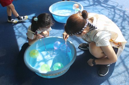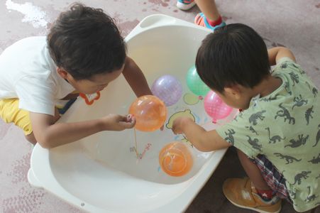 「ヨーヨー釣り」のみ外で行いました。タライやベビーバスに水を張り、専用の釣り具で釣り上げます。早くしないと紙が解けてしまいます。