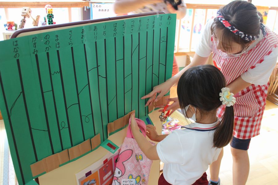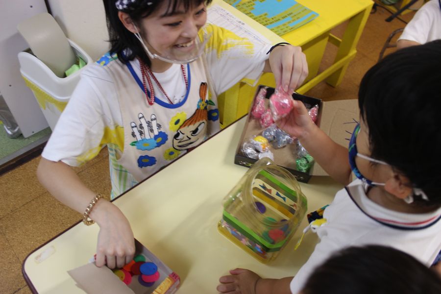 夏の恒例行事「さぎぬま縁日」をコロナ禍の中でも何とか実施してあげようと、今年は「おたのしみ会」という形でミニ縁日をクラス毎に行いました。