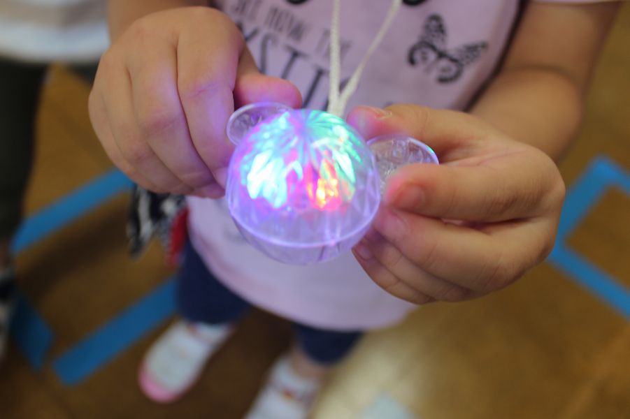 キラキラ光るペンダントはミッキーの形やスマイルくん、中にはイルカの形のものもあり皆大喜び。部屋の電気を消し暗くして楽しむクラスもありました。