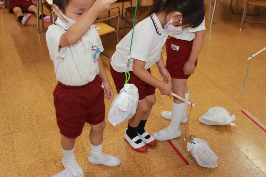 年長組は前日に自分達で手作りした釣り竿で行いました。ちょっと暑かったけど大型扇風機を回しながらベランダで実施しました。