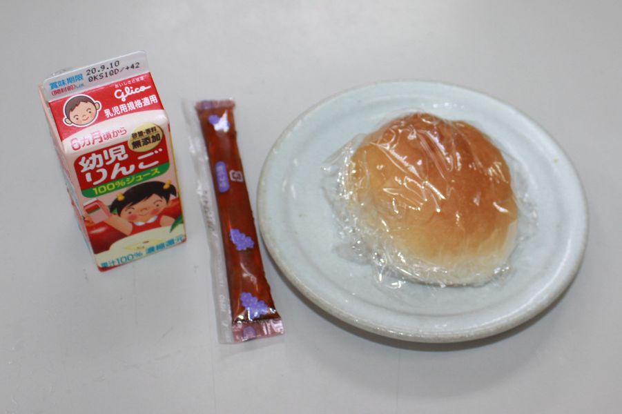 最後は「食べ物」のコーナーです。「ゼリー」に「りんごジュース」にフワフワの「やさいパン」もありました。