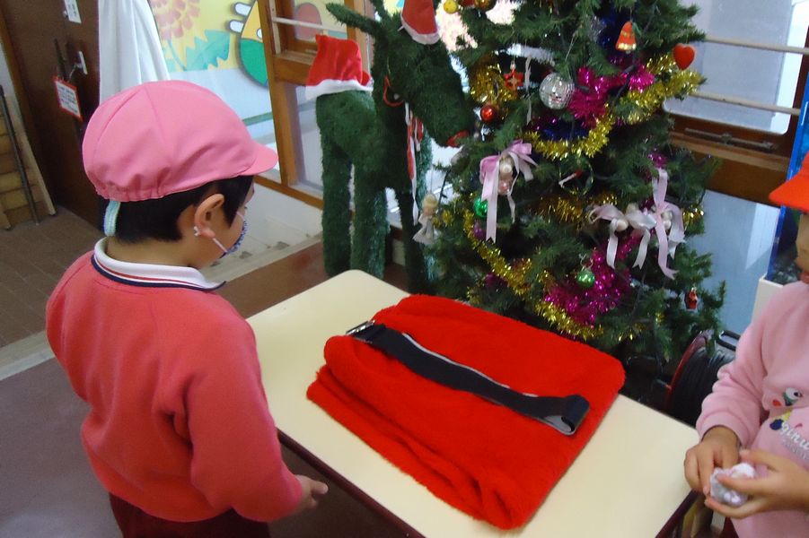 翌日のクリスマスイブの朝登園すると…、置いておいたズボンとベルトが無くなっていてクリスマスツリーにサンタさんからの手紙が貼ってありました。