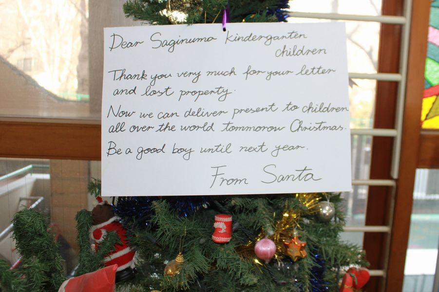「きっとあわてんぼうのサンタクロースなので忘れて行ってしまったんだね」と、メッセージを添えてクリスマスツリーの所に置いておきました。