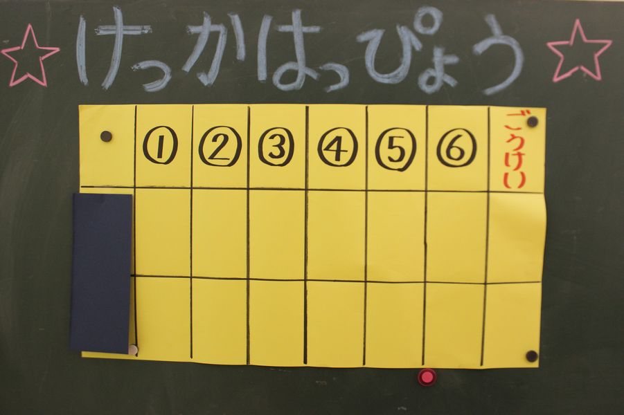 取った絵札はグループ毎に枚数を子ども達で数えて先生に報告します。それを元に黒板の集計表に記入していきます。