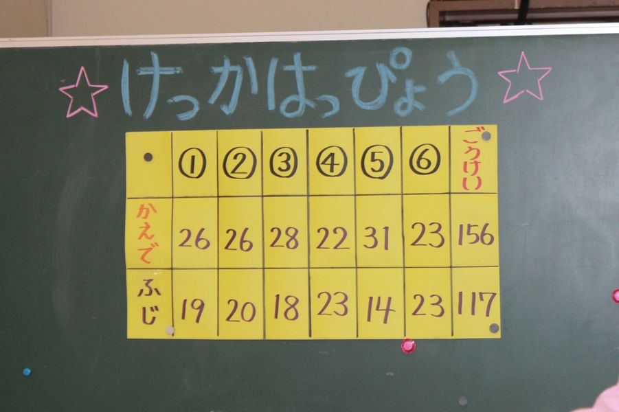 6グループそれぞれの集計結果が発表され「かえで組」と「さくら組」が勝利を収めました。負けたチームも100枚以上取れたので大興奮でした。