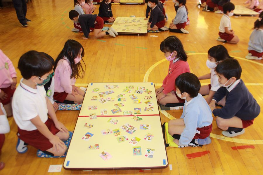年長組が令和3年度初の学年集会を開き、毎年恒例の『クラス対抗カルタ大会』を体育室で開催しました。