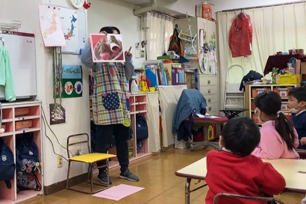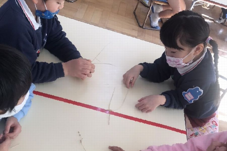 各クラスでは学年毎に趣きのある「お餅」に関する座学を開いてから見学しました。年長組は稲に付いている籾(もみ)を剥いて中身を確認する体験をしました。