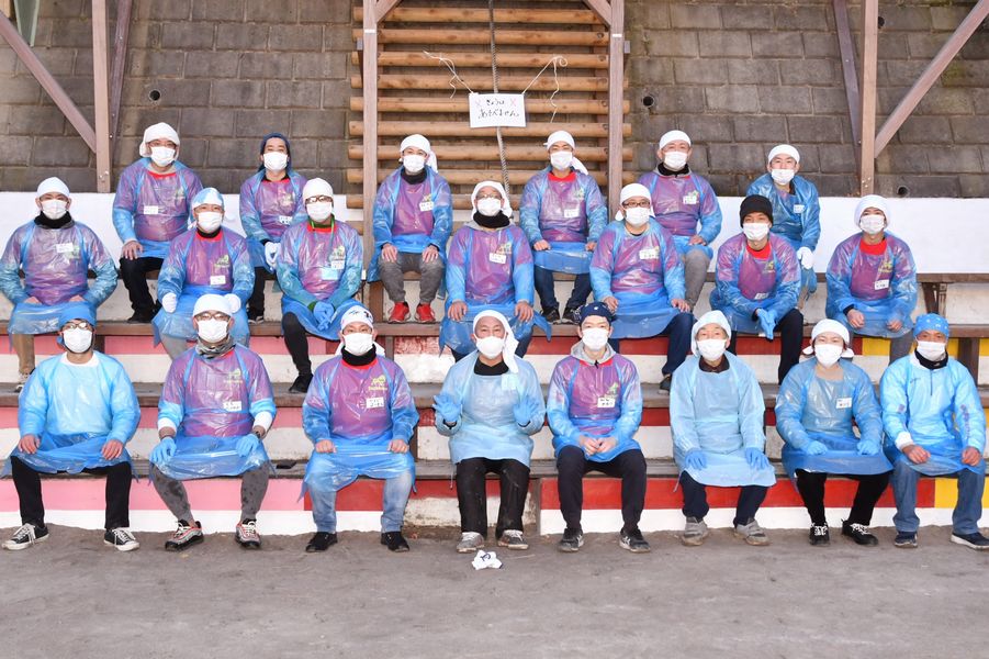念には念を重ね、ビニール装具を着用し食品用の青いビニール手袋を着けてもちつきを行って下さいました。手際良く11時前には終了しました。