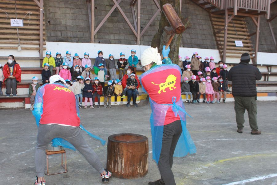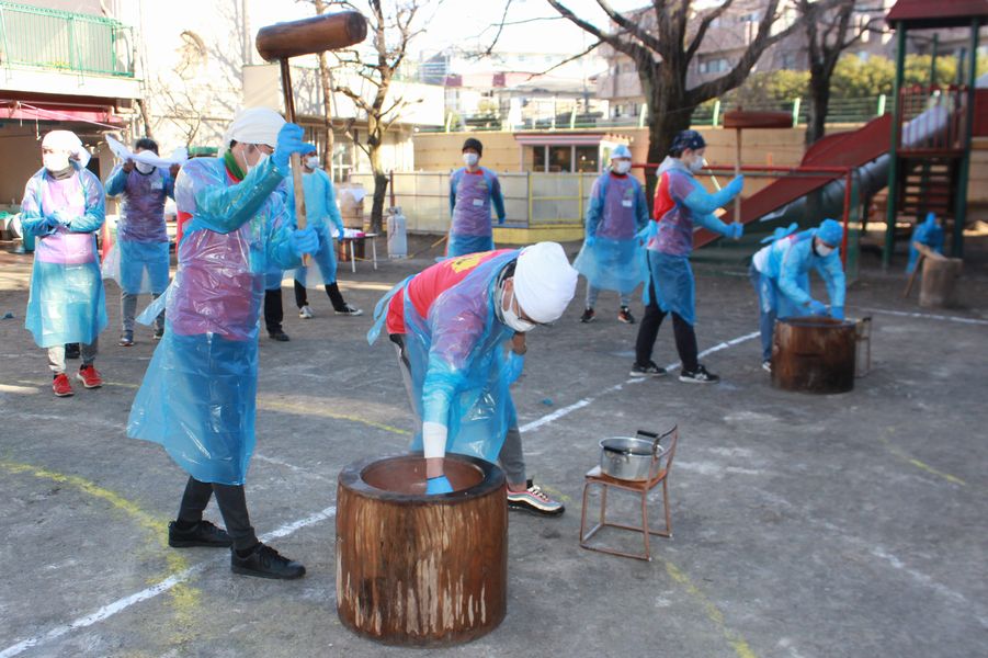 コロナ禍でしたが何とかお餅が出来上がる様子だけでも見せてあげたいと『もちつき』を行いました。