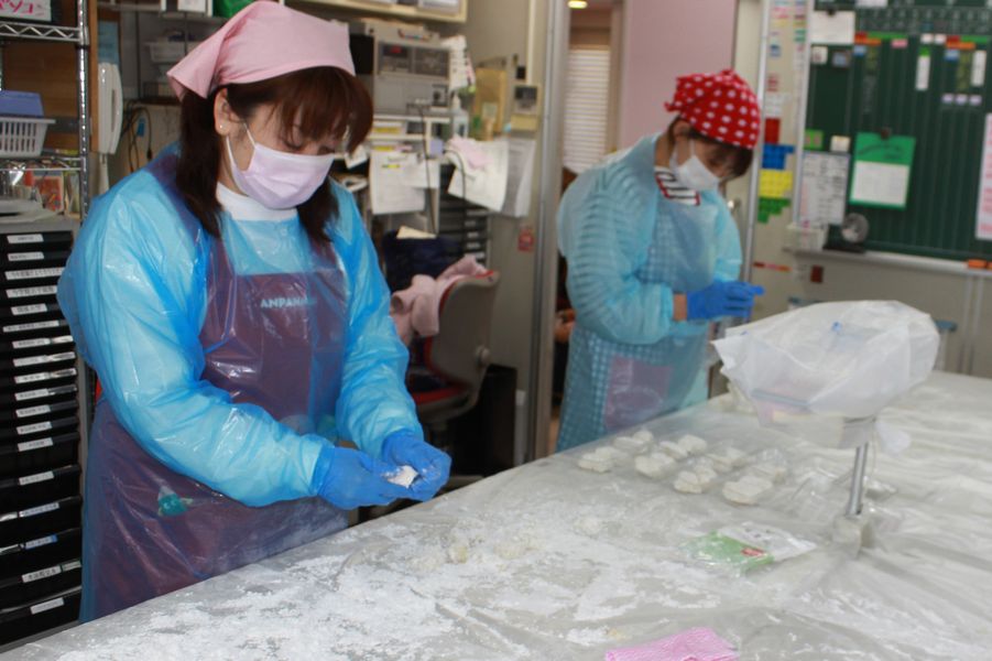 年少組の副担や年中組学年担当の先生、事務の先生のお手伝いも仰ぎ、先生達だけで全園児307人分+αの白餅のお土産を頑張って作り上げました。