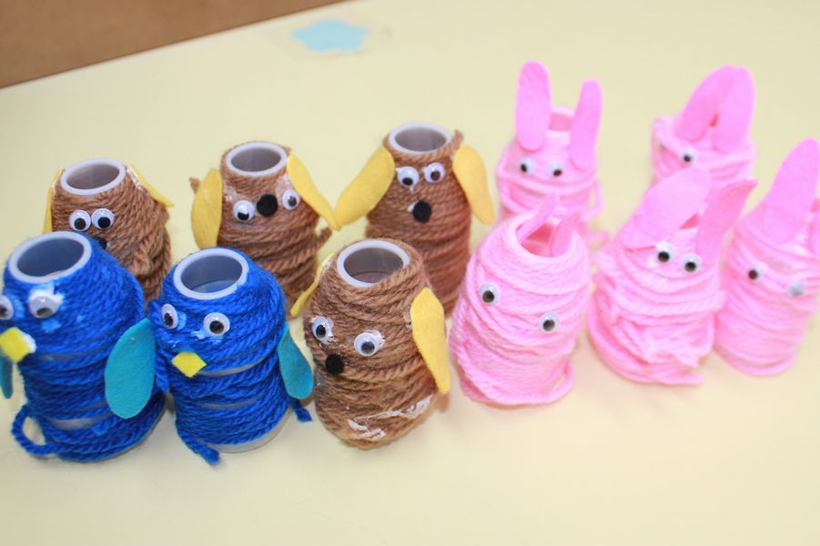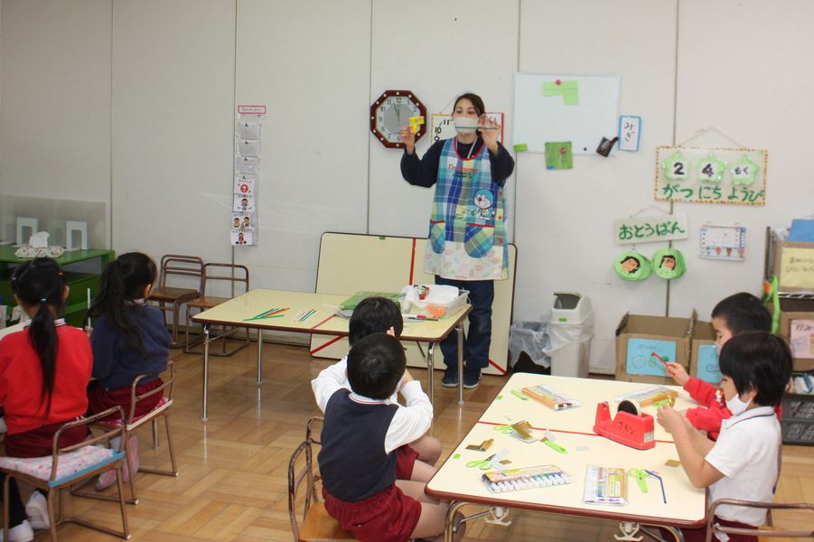 その他毛糸を使った制作では、年少組は可愛いらしいペンギンやウサギの「ヤクルト人形」に、年中組は割り箸で「十文字掛け」に挑戦していました。