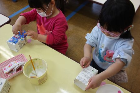 集めさせて頂いた牛乳パックに布を貼り年少組は「ペン立て」を、年中組は「びっくりカメラ」を作りました。