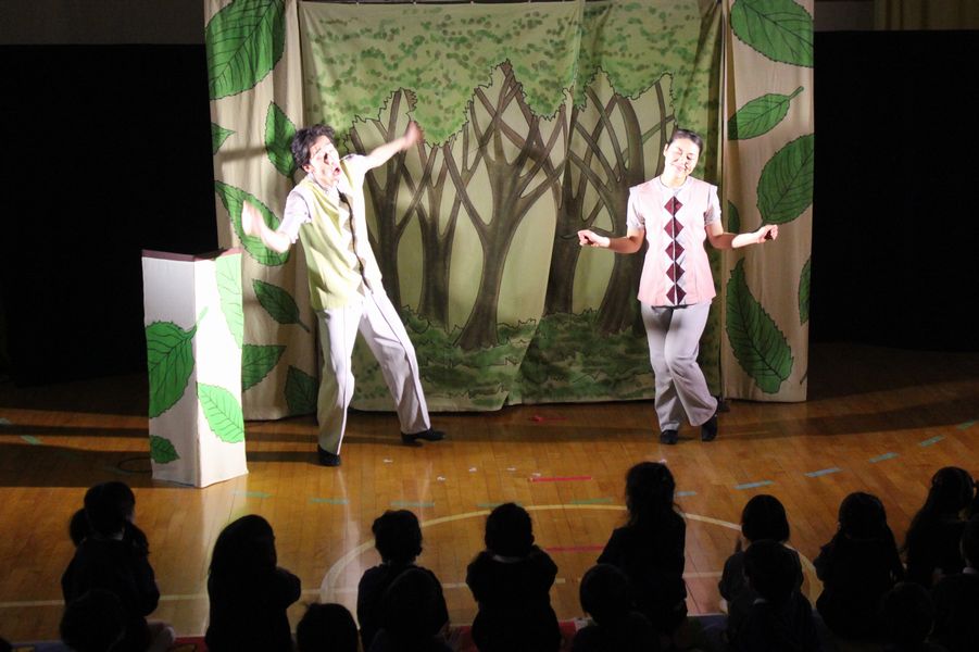 例年は縦割りに2回に分けて上演していましたが、今年はコロナ禍なので特別に学年毎に3回上演して頂き子ども達はゆったりと観劇しました。