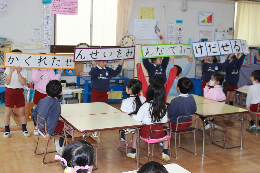 続いて各クラス毎に見つけ出したパネルを正しい順に並び変えてみると…次の挑戦は『先生達全員とのかくれんぼ対決』でした。