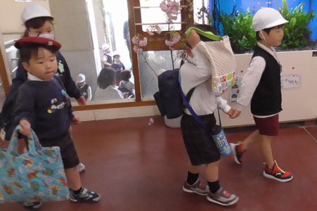 お世話係の子は普段よりも15分程早く登園し素早く着替えると正門ピロティに集合します。カラー帽子を白に変えて、今か今かと年中組の子ども達が来るのを待ち構えています。