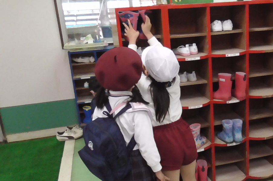 年中組が登園してくるとそっと手を差し伸べ「一緒に行こうね」と声を掛け手をつないでお部屋まで連れて行きます。名札の色を確認してクラスが分かると、まず最初に下駄箱まで連れて行きます。