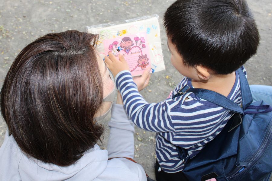 年少組の子ども達から贈られたのは『手作りのポーチ』です。カーネーションも一緒に添えて渡しました。そのほかに「おかあさん」の歌も歌いました。