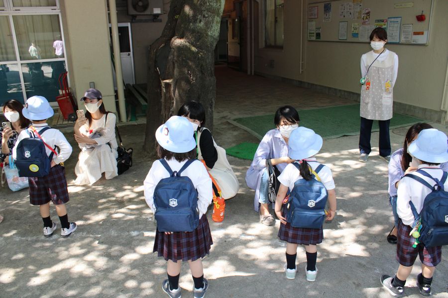 最後は歌のプレゼントです。「ママとゴーゴー」を顔を見つめながら歌いました。今日は五月晴れに恵まれ二学年とも無事園庭で行えて良かったです。今日から衣替えで被ってきた水色の夏帽子が青空にとても映えていました。