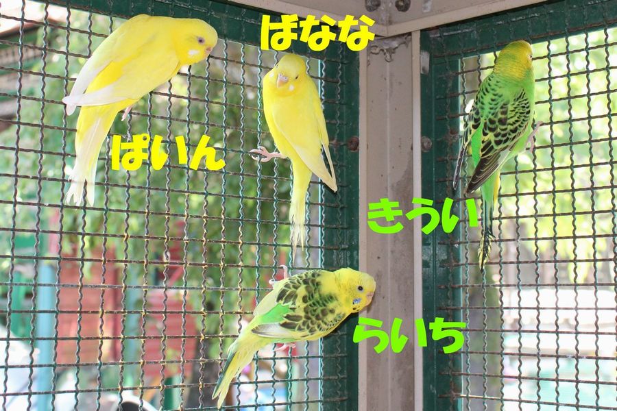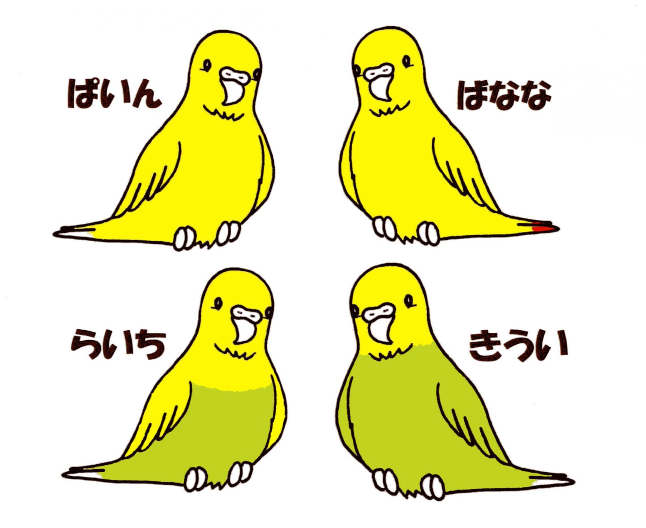 黄色の「ぱいん」と「ばなな」はちょっと見分けずらいのですが、尾羽の部分が茶色くばさばさしているのが「ばなな」です。「らいち」と「きうい」の違いは緑と黄色の割合です。首から上だけ黄色いのが「きうい」です。