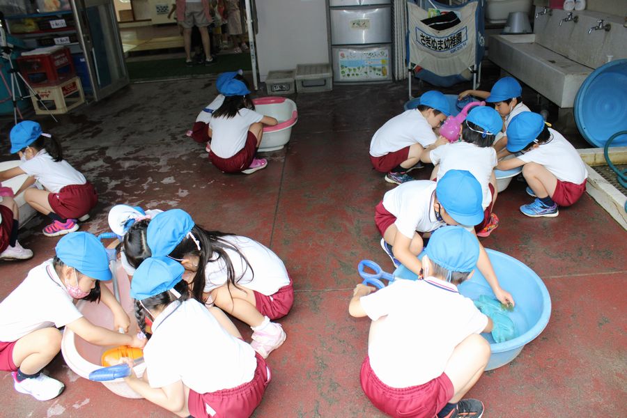 一学期も間もなく終了し、来週の火曜日から夏休みになります。そこで、年中組と年長組が学期末恒例の風物詩『園庭遊具洗い』を行いました。