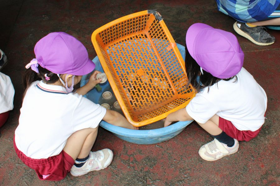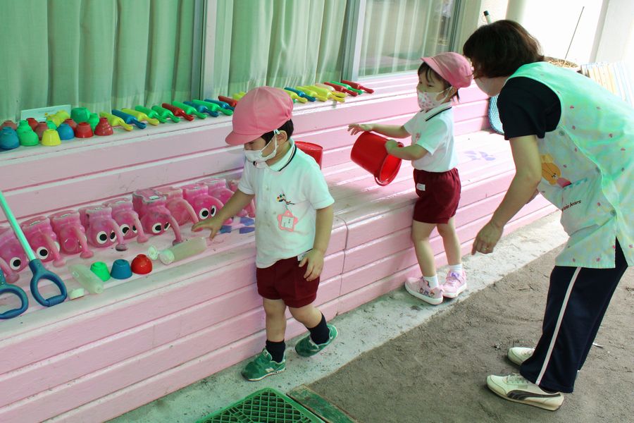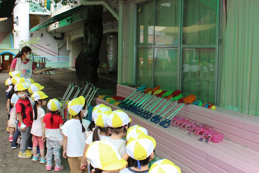 学期末は園庭遊具だけでなく、各クラス毎に保育室で使っていた遊具や道具、ロッカーやテーブル、靴箱なども皆できれいに掃除しています。夏休み中もぜひたくさんお手伝いをさせ、生活体験豊かにしてあげてください。