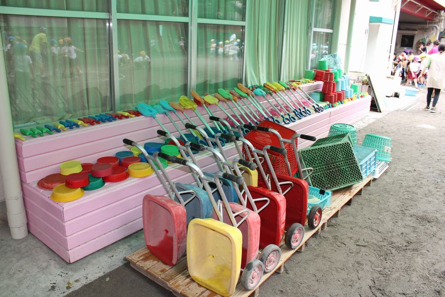 年長組は遊具が入れてある籠やケースも水洗いしてくれました。また、皆に大人気の砂場用のカート(二輪手押し車)も皆で協力して洗ってくれました。