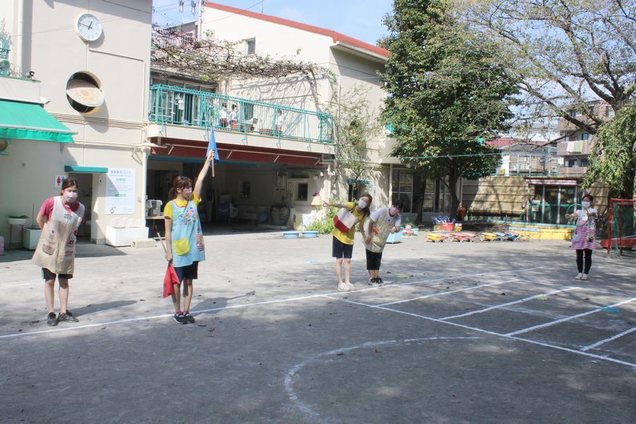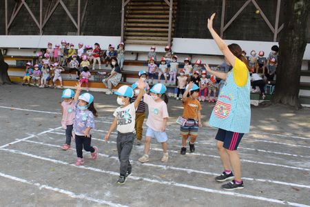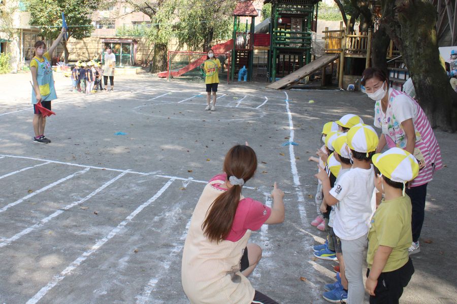 学年集会は、お弁当を食べた後、園庭に年少組4クラスが一同に集い開かれました。園庭の地面には白いラインパウダーで道路と横断歩道が描かれ、さながら即席の「さぎぬま道路」が作られています。
