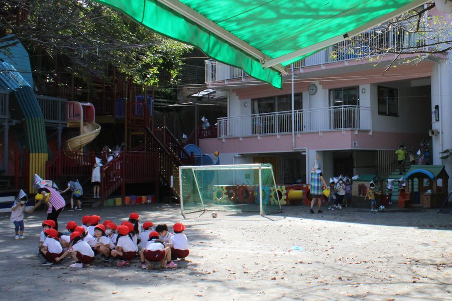 年長組と年少組は保育室、年中組は園庭で自由遊びを楽しんでいる時間でしたので、突然のことに少し戸惑う様子はありましたが、教師も子ども達も落ち着いた行動をとる事ができ、放送から約3分程で全員が集まりました。