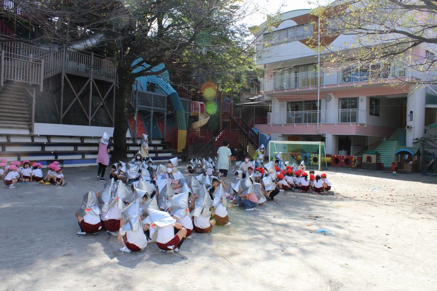 自由遊びの真っ最中に突然避難訓練開始の放送を入れました。遊びは即時に中断して、大地震を想定しているので、揺れが収まるまで体をかがめる練習をしました。その後園庭に全園児が集まりました。
