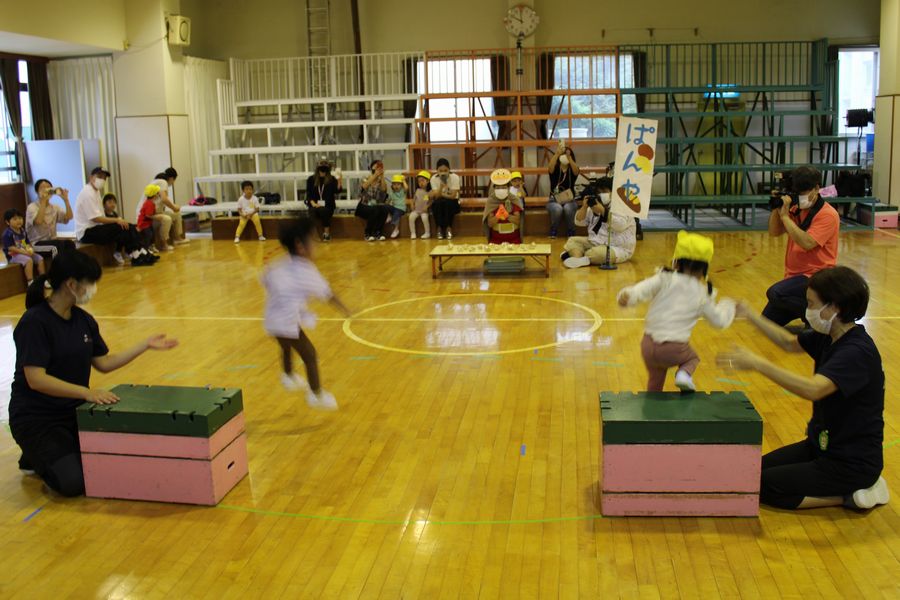 全員で準備体操をしたら最初は「ぱんやさんでお買い物」に行きます。パン屋にはパンダ、コアラ、ハロウィンをあしらった三種類のメロンパンが売っていて、子ども達はよーいどんで大型積み木を越え買い物に行きます。