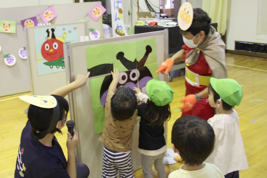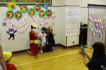 『ファミリーデー』のテーマは「アンパンマンとあそぼう」です。今日は本物の?アンパンマンも会場に駆けつけてきてくれました。アンパンマンの仲間たちも登場してきて楽しい会がスタートしました。