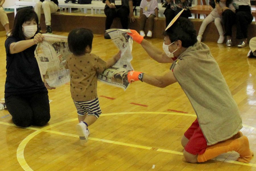 怒ったバイキンマンが仲間を沢山連れてきたので、今度は子ども達がアンパンマンになり「あーんパンチ」でやっつけます。バイキンマンが描かれている新聞紙に向かって猛ダッシュ!新聞バイキンマンは真っ二つに割れました!