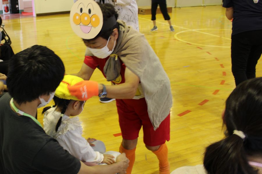 頑張った子ども達にはアンパンマンから金メダルが一人ひとりに授与され、先生方からもご褒美が手渡されました。そしてフィナーレは全員で「アンパンマン」の曲に合わせ親子リズムを踊り閉会となりました。