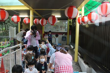 タライで行う『ヨーヨー釣り』はお部屋ではできないので、年中組は園庭ピロティで、年長組はベランダで、年少組は西門ピロティで、それぞれクラス毎に入れ替え制で行いました。