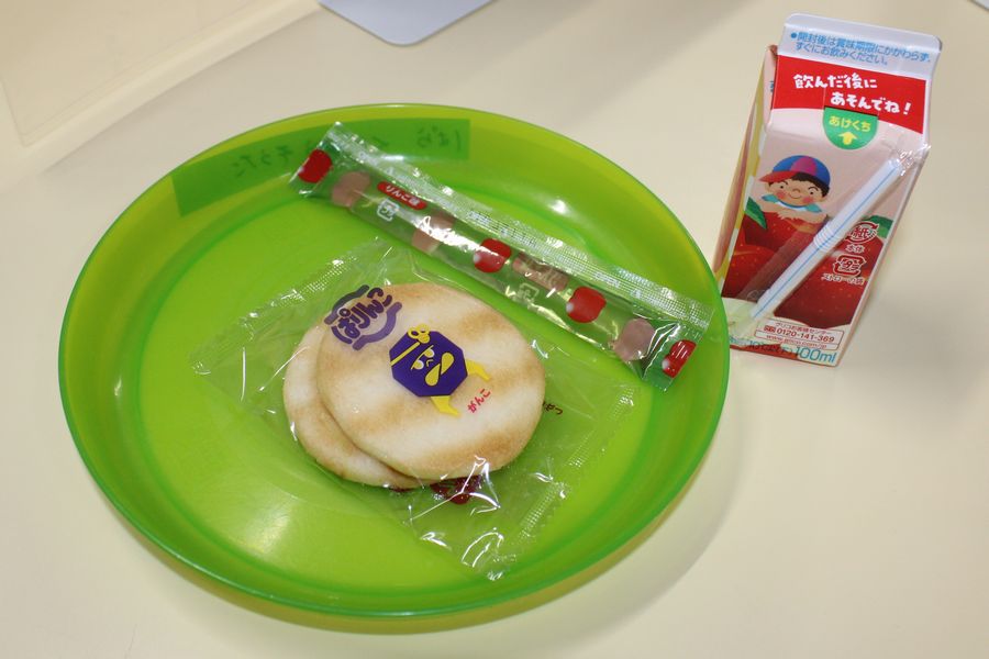縁日遊びが終わるとおやつタイムです。本日のメニューはばりんこ煎餅にスティツクゼリー。果汁100%の幼児りんごジュースもいただきました。
