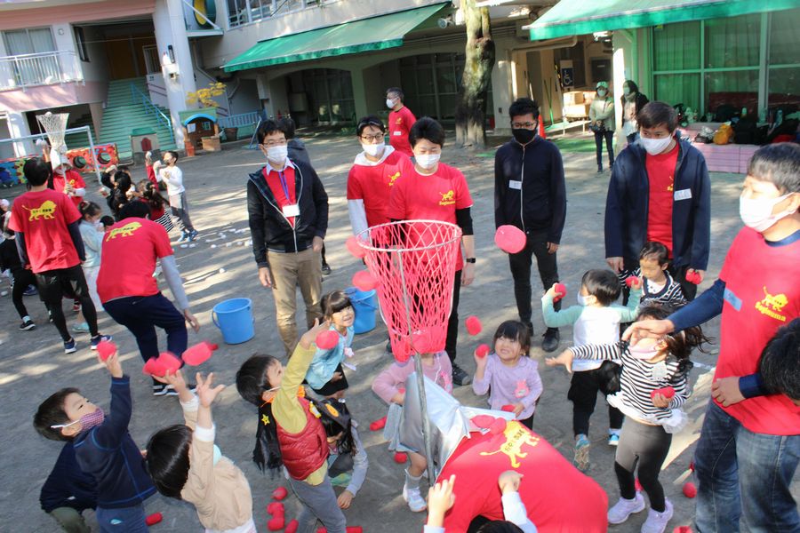 今回の企画は二部構成で、第一部が『ミニ運動会』です。最初の種目は「玉入れ」。年中組以下のちびっ子チームと年長組以上の兄姉チームに分かれ対決しました。一回戦は接戦でしたが、二回戦はおんぶのハンディがあったちびっ子チームが100個以上入れて圧勝しました。
