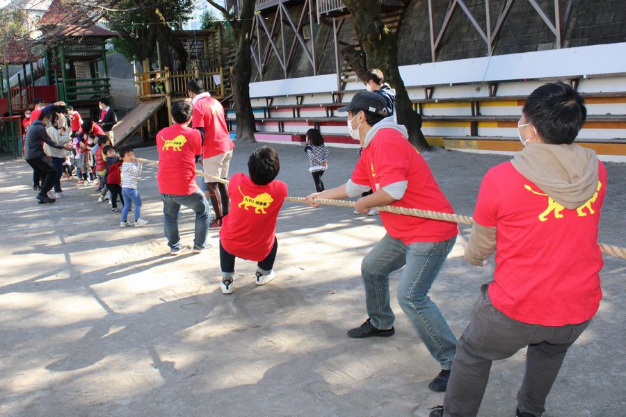 二種目は綱引きを行いました。最初は幼稚園児vs小学生で対決し、今度は小学生が勝ちました。次に子ども達からの挑戦もあり子どもチームvsお父さんチームも行い、こちらは子ども達が二連勝しました。
