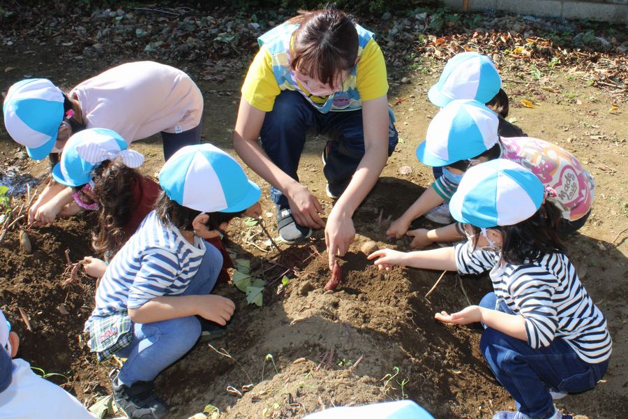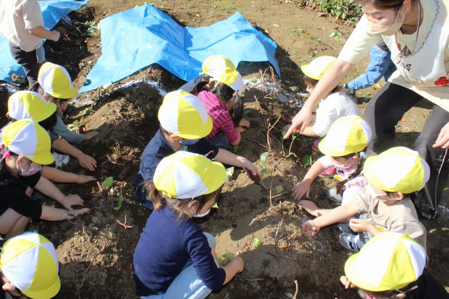 5月に年少組の子ども達が園の畑に植えたサツマイモの苗が大きく育ち収穫の時期を迎えました。「皆で掘りに行ってみよう」と話すと子ども達は大喜び。宝探しに行く気分で畑に向かいました。