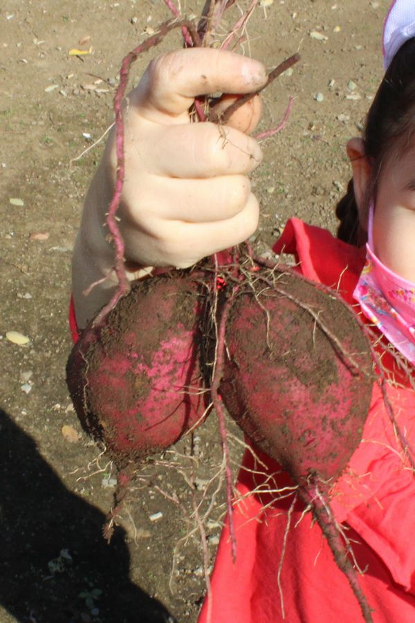 次々に掘り当てる子ども達。顔の大きさ位ある長芋くんや、まん丸太っちょのデブ芋ちゃんや、双子のお芋まで…掘り出す度嬉しそうに見せに来てくれます。