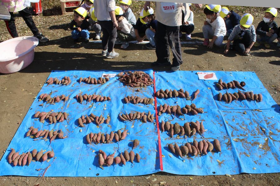 今日は天気も良くプレイルームのことり組とこぐま組も近隣の畑に芋掘りに出かけました。年長組が芋掘りをした所を同じ場所です。こちらも豊作だった様子。芋は天日干しすると甘くなるとの事。是非試してみてください。