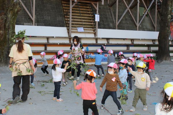 お弁当の後の自由遊びの時間は、獲れた芋の蔓(つる)を使って遊びました。引っ張りっこしたり、大縄跳びしたり、先生に冠を作ってもらつたり…。まるまる一日お芋で楽しみました。