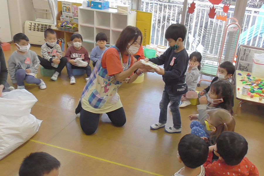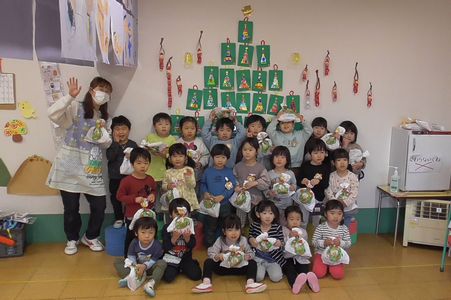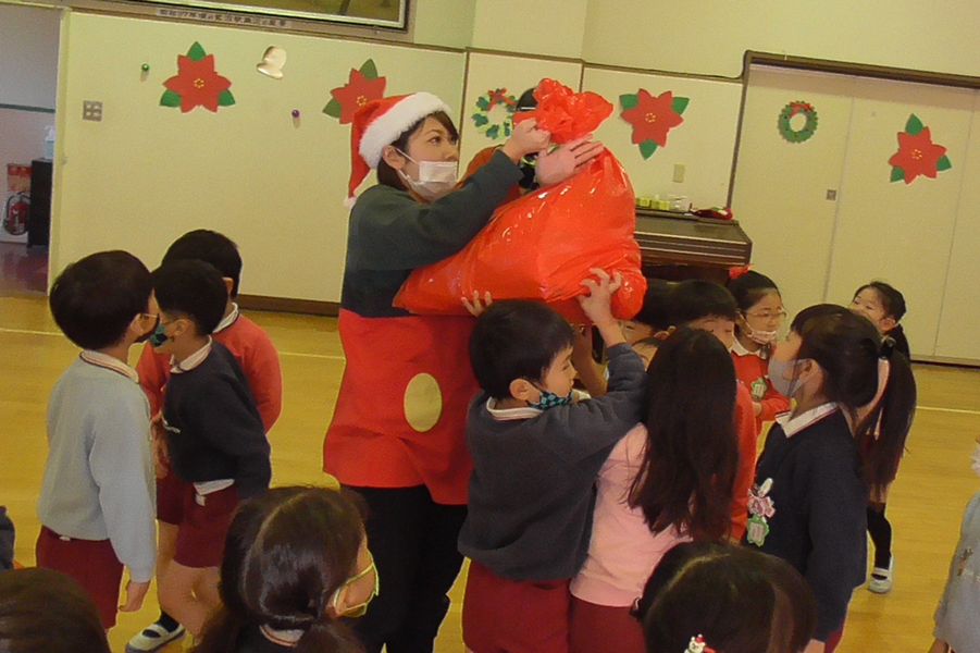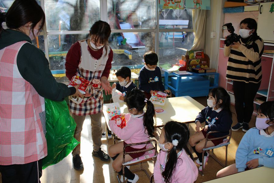 「きっとサンタさんからのプレゼントだ!」と、部屋に持ち帰り袋の中を見て見ると子ども達の人数+先生分のクリスマスプレゼントがぎっしり入っていて大喜びの子ども達。早速皆に手渡しました。
