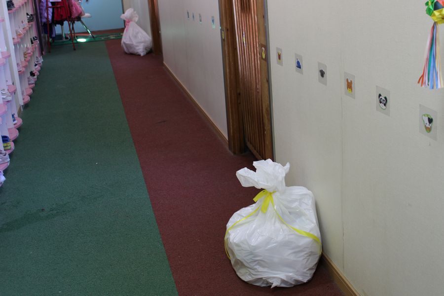 「どうやら体育室に秘密があるらしい」と全員で体育室に行ってみると、ずっしり重たい大きな袋がクラスの数分置いてありました。