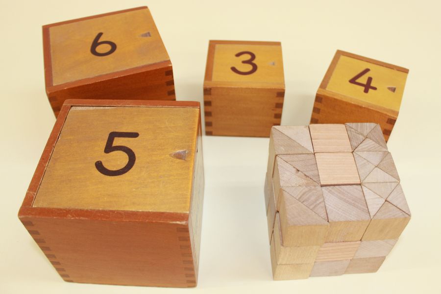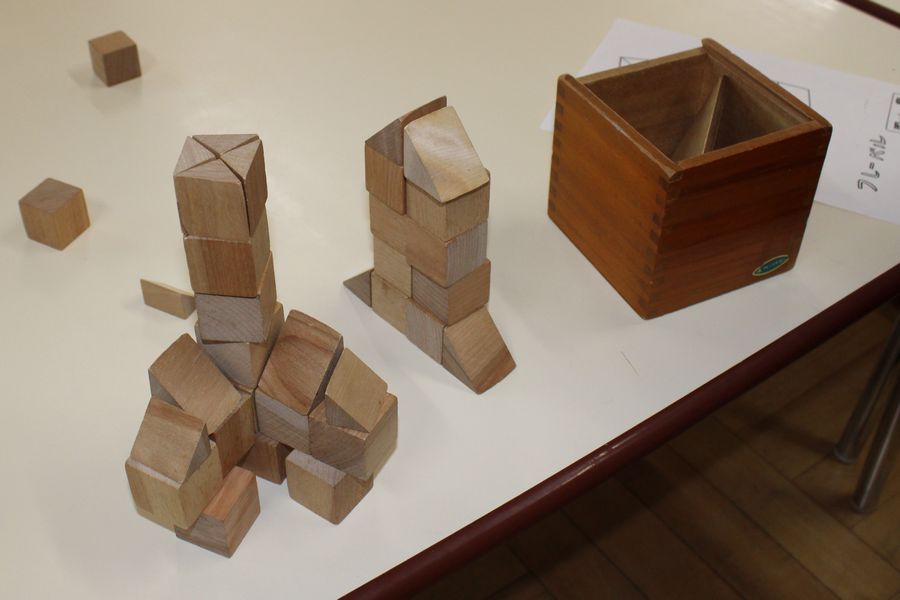 第5恩物は21個の小立方体と6個の大三角柱と12個の小三角柱で構築されている立方体の構築積み木で「建築積木」とも呼ばれている教具です。