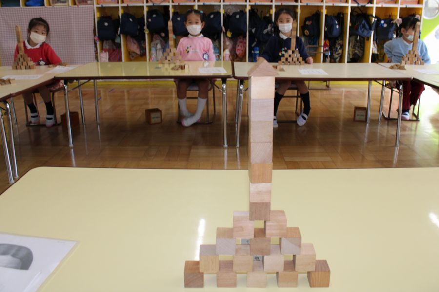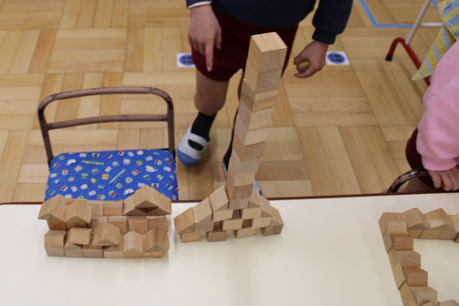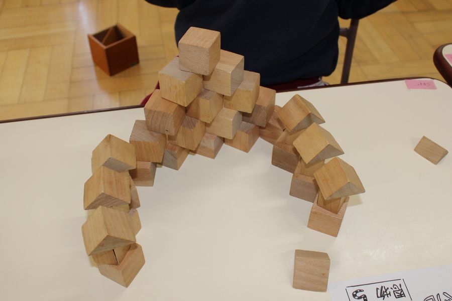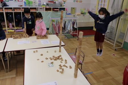 慎重に積み上げないと崩れやすく、手先の器用さとバランス感覚が必要です。 子ども達の『出来たー!!』を大切に少しドキドキの緊張感も味わいながら楽しみました。